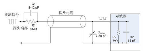 無源探頭的衰減功能是通過內(nèi)部電阻器來實現(xiàn)的,這一設(shè)計擴大了示波器的電壓測量范圍。當(dāng)內(nèi)部電阻器與示波器的輸入電阻配合使用時,會形成一個分壓器。以典型的10x探頭為例,其內(nèi)部裝有一個9MΩ的電阻器。當(dāng)這個探頭與具有1MΩ輸入阻抗的示波器連接時,會在示波器的輸入通道上產(chǎn)生10:1的衰減比。這意味著示波器上顯示的信號幅度將是實際測量信號幅度的十分之一。因此,在使用這類探頭時,我們還需要在示波器的通道設(shè)置中調(diào)整衰減比至相應(yīng)的值(如10X),以確保測量結(jié)果的準(zhǔn)確性
